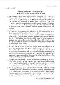 ក្រសួងការបរទេស បានបន្តថា នៅក្នុងកិច្ចប្រជុំពិសេសគណៈកម្មាធិការព្រំដែនទូទៅ កាលពីថ្ងៃទី១០ ខែកញ្ញា ឆ្នាំ២០២៥ ភាគីទាំងពីរបានបញ្ជាក់ជាថ្មីនូវការប្តេជ្ញាចិត្តដែលបានធ្វើឡើងនៅក្នុងកិច្ចប្រជុំមុនៗ ដើម្បីបញ្ចៀសសកម្មភាព ដែលអាចបង្កើនភាពតានតឹង ឬពង្រីកតំបន់ជម្លោះ។ កម្ពុជាបាន និងកំពុងអត់ធ្មត់បំផុត និងអនុវត្តយ៉ាងតឹងរ៉ឹងចំពោះលក្ខខណ្ឌនៃកិច្ចព្រមព្រៀងបទឈប់បាញ់ តាមសេចក្តីប្រាថ្នា ដែលភាគីទាំងពីរបានលើកឡើងដូចគ្នាថា នេះគឺជាពេលដែលទាំងសងខាងគួរតែរួមគ្នាខិតខំលើកកម្ពស់បរិយាកាសអំណោយផលសម្រាប់ការបន្ធូរបន្ថយភាពតានតឹងបន្ថែមទៀត កសាងទំនុកចិត្តរវាង គ្នាទៅវិញទៅមក ដើម្បីឆ្ពោះទៅរកប្រក្រតីភាពឡើងវិញ។