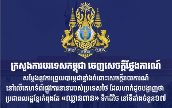 (ភ្នំពេញ)៖ ក្រសួងការបរទេស និងសហប្រតិបត្តិការអន្តរជាតិ នៃព្រះរាជាណាចក្រកម្ពុជា នៅថ្ងៃទី២៥ ខែកញ្ញា ឆ្នាំ២០២៥នេះ បានចេញសេចក្តីថ្លែងការណ៍សម្តែងនូវការព្រួយបារម្ភជាខ្លាំងចំពោះសេចក្តីរាយការណ៍ថ្មីៗនេះ នៅលើគេហទំព័រផ្លូវការនានារបស់ប្រទេសថៃ ជាពិសេសគេហទំព័ររបស់ការិយាល័យអ្នកនាំពាក្យកងទ័ពជើងទឹកថៃ និងទីបញ្ជាការដ្ឋានការពារ ព្រំដែនច័ន្ទបុរី-ត្រាត ព្រមទាំងកាសែត The Nation (ប្រទេសថៃ) ដែលហាក់ដូចបង្ហាញថា ប្រជាពលរដ្ឋខ្មែរកំពុងតែ “ឈ្លានពាន» ទឹកដីថៃ នៅទីតាំងចំនួន១៧ ស្ថិតនៅតំបន់ពីខេត្តពោធិ៍សាត់ ដល់ខេត្តកោះកុង រួមទាំងតំបន់ស្រុកវាលវែង ខេត្តពោធិ៍សាត់ នៃប្រទេសកម្ពុជា ដែលស្ថិតនៅទល់មុខ នឹងស្រុកមឿង ខេត្តត្រាត នៃប្រទេសថៃ។